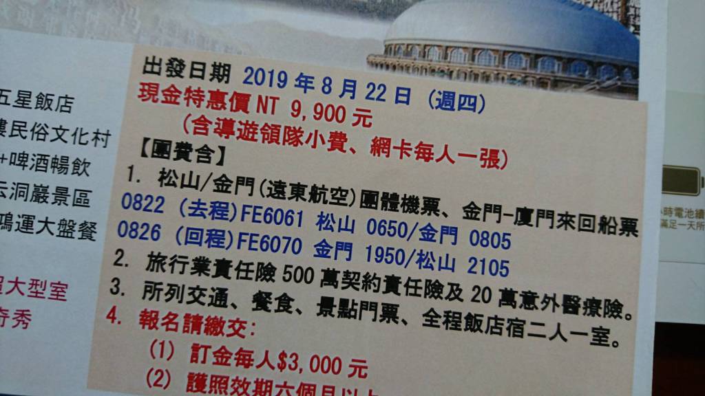 1.費用的細節 : 主行程費用外,是否含簽證、導遊、地陪、司機小費,機場接送費,靚媽年輕時不懂事,曾看電視購物被低價吸引,最後拿到票券時,發現還得另付約6000元所謂的燃料費及機場稅等,真的相當傻眼。至於飯店床頭小費或行李小費則隨個人意願,一般是不含在團費中。